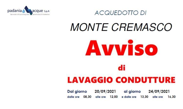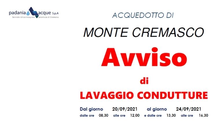 Dal giorno 20.09.2021 al giorno 24.09.2021 dalle ore 08.30 alle ore 16.30 si procederà al lavaggio di condutture dell'acquedotto di Monte Cremasco