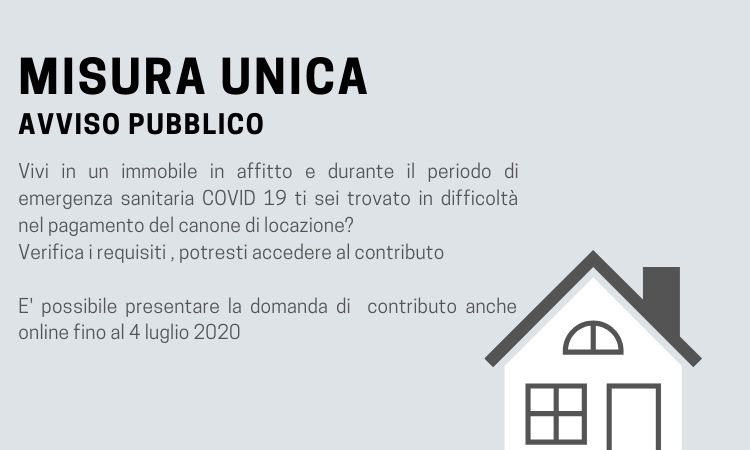 Si comunica che è stato pubblicato sul sito di Comunità Sociale Cremasca, nella sezione Amministrazione trasparente -> Sovvenzioni, contributi, sussidi e vantaggi economici, l’Avviso Pubblico MISURA UNICA DI SOSTEGNO DELLE FAMIGLIE PER IL MANTENIMENTO DELL’ABITAZIONE IN LOCAZIONE ANCHE IN RELAZIONE ALL’EMERGENZA SANITARIA COVID 19 DGR N° XI /3008 del 30 Marzo 2020.