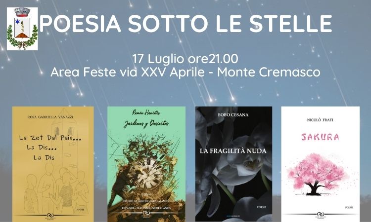 Sabato 17 Luglio 2021 alle ore 21.00 presso l'Area Feste in via XXV Aprile a Monte Cremasco si terrà l'evento POESIA SOTTO LE STELLE - Letture poetiche
